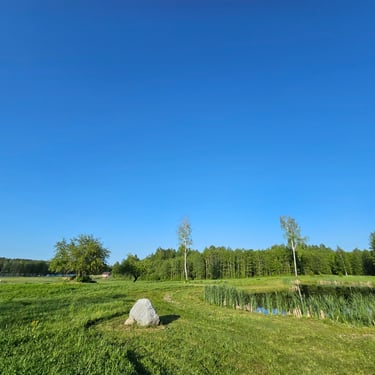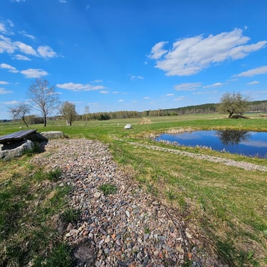 Šis sklypas unikalus tuo, kad viena kraštine ribojasi su bendru sklypu, kuriame yra tvenkinys. Todėl būsite apsupti artimu nuostabiu kraštovaizdžiu. Pasistačius sodybą, pro jos langus atsivers nuostabus vaizdas į ežerą ir į tvenkinį, todėl galėsite mėgautis kavos puodeliu bei pasakiškais vaizdais. Sklype jau auga subrendę vaismedžiai. Vienas iš bendruomenės vandens gręžinių yra šiame sklype